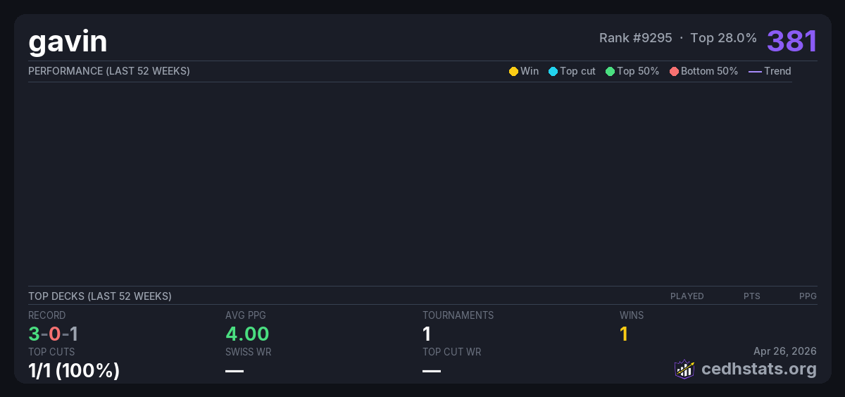 | monday cedh Aug 04, 2025 · 16 players | — | 1/16 | 3-0-1 | 4.00 | 381 |