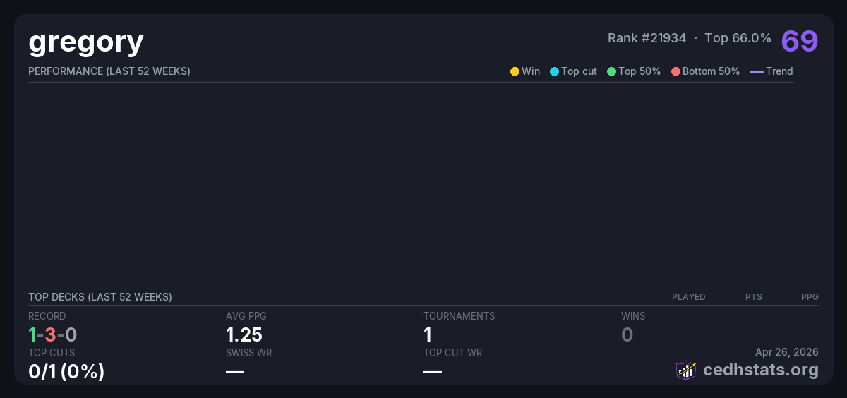 | Tournament | Deck | Result | Record | PPG | Points ? |
