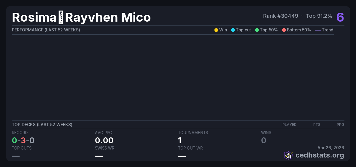 | Bracket 3 Commander Sep 21, 2025 · 20 players | — | 18/20 | 0-3-0 | 0.00 | 6 |