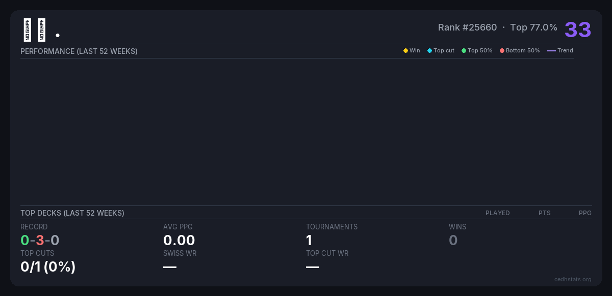 | 12月14日CEDH年终赛 Dec 14, 2025 · 40 players | 28/40 | 0-3-0 | 0.00 | 33 |