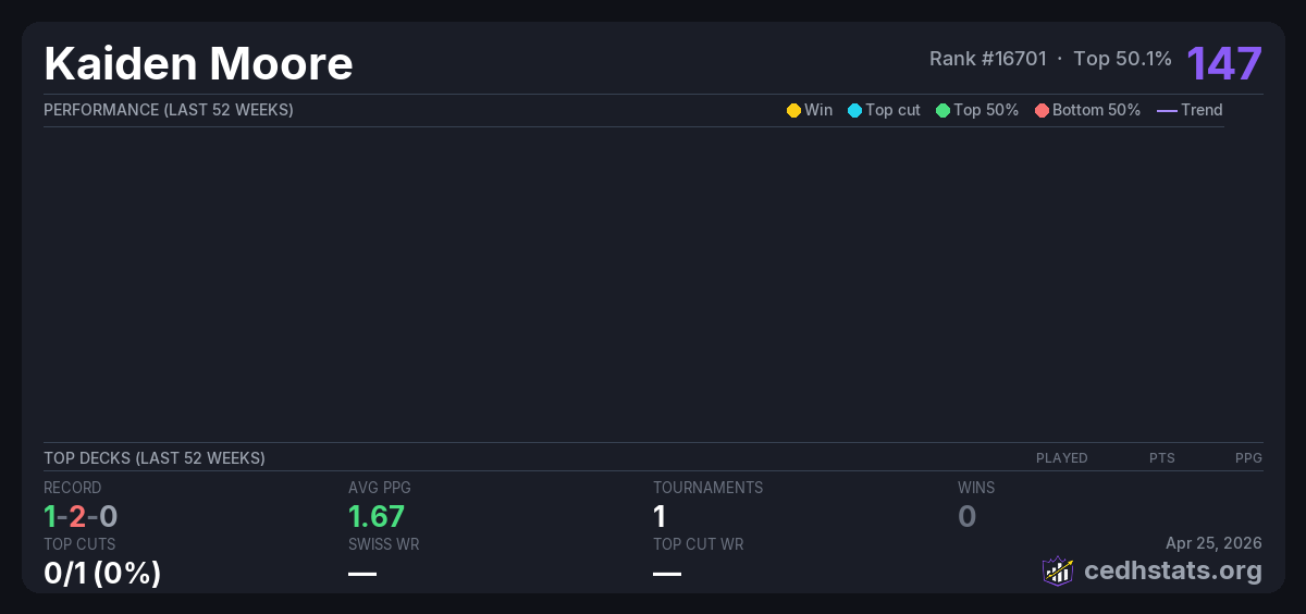 | Store Championship Sep 06, 2025 · 26 players | Invalid pairing | 8/26 | 1-2-0 | 1.67 | 147 |