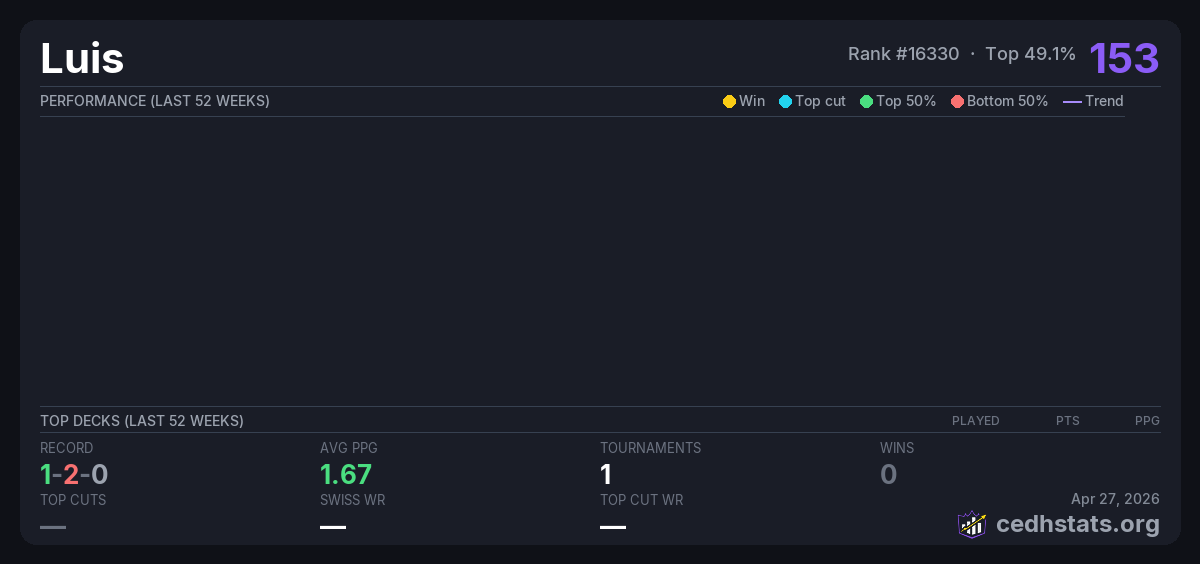 | Magic 2.0 #1 May 23, 2025 · 16 players | Invalid pairing | 4/16 | 1-2-0 | 1.67 | 153 |