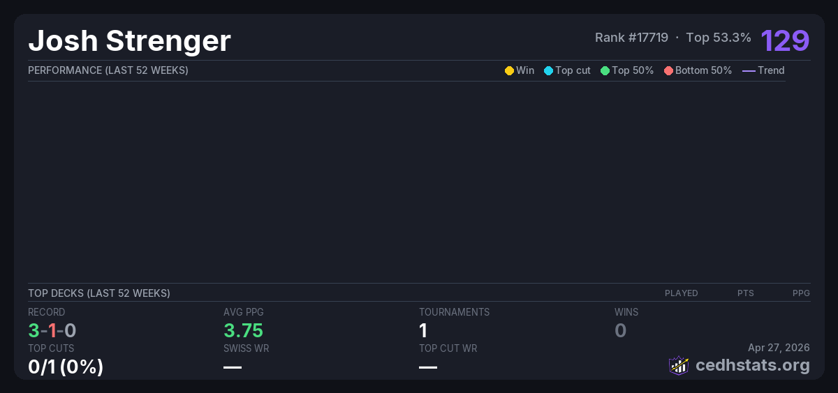 | Mt Moon cEDH - Mox Diamond Nov 22, 2025 · 16 players | Invalid pairing | 5/16 | 3-1-0 | 3.75 | 129 |