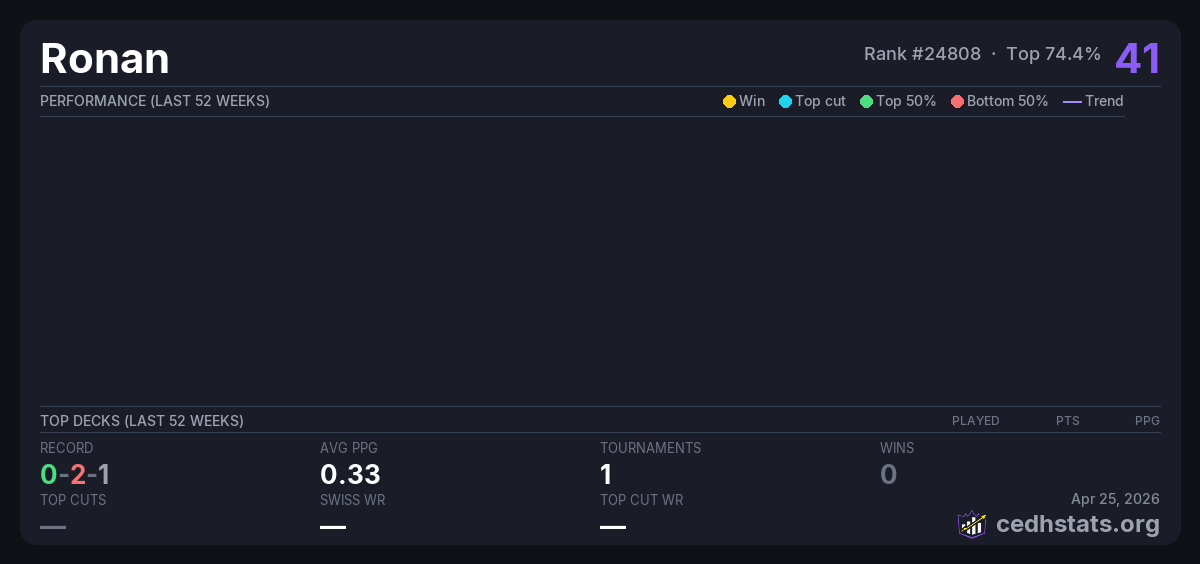 | Unaltered Precon Oct 12, 2025 · 26 players | Invalid pairing | 17/26 | 0-2-1 | 0.33 | 41 |