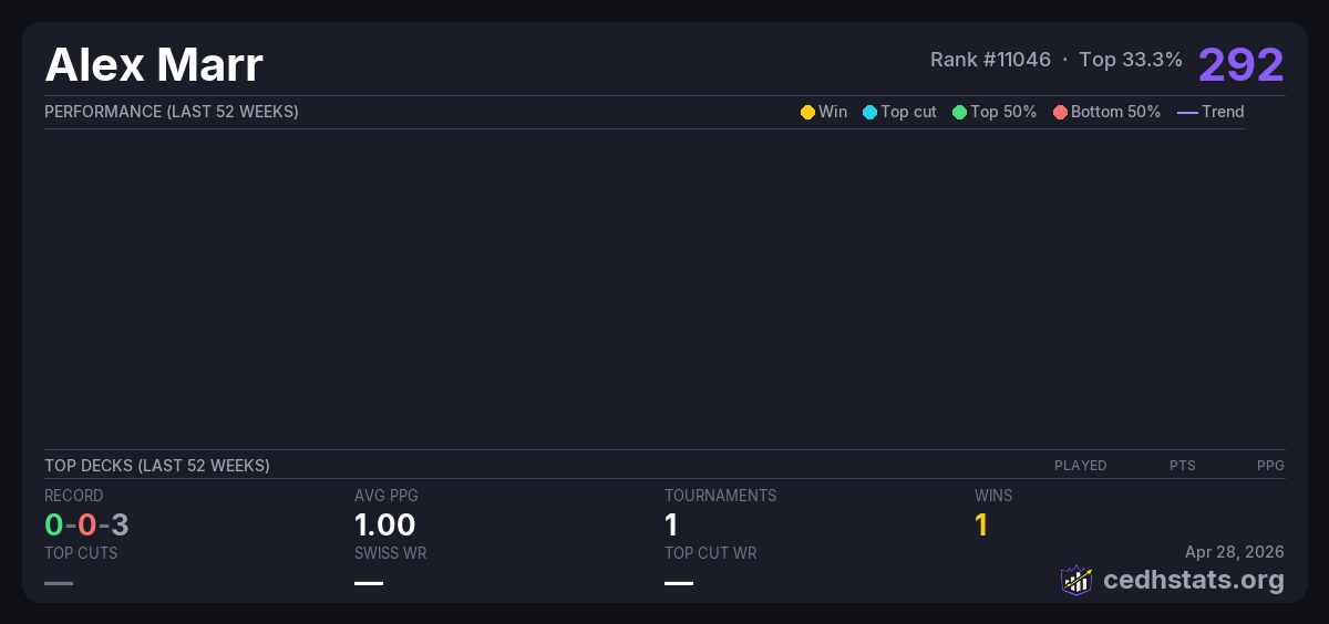 | Commander Tuesday - Nov 4th Nov 05, 2025 | Invalid pairing | 1/27 | 0-0-3 | 292 |