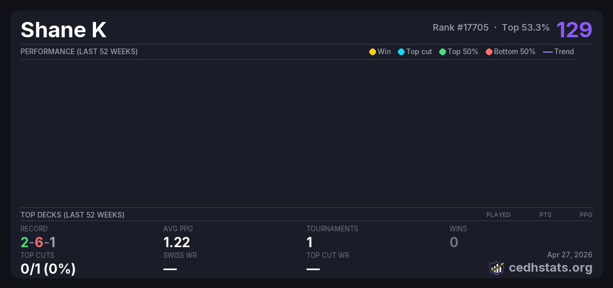 | Iron Lion June CEDH League Jun 04, 2025 · 17 players | — | 6/17 | 2-6-1 | 1.22 | 129 |