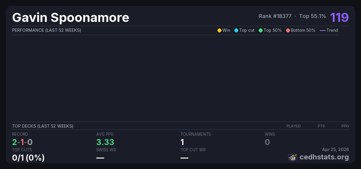 | Commander Preconstructed Suicide Awareness Tournament Feb 28, 2026 · 28 players | 11/28 | 2-1-0 | 3.33 | 119 |