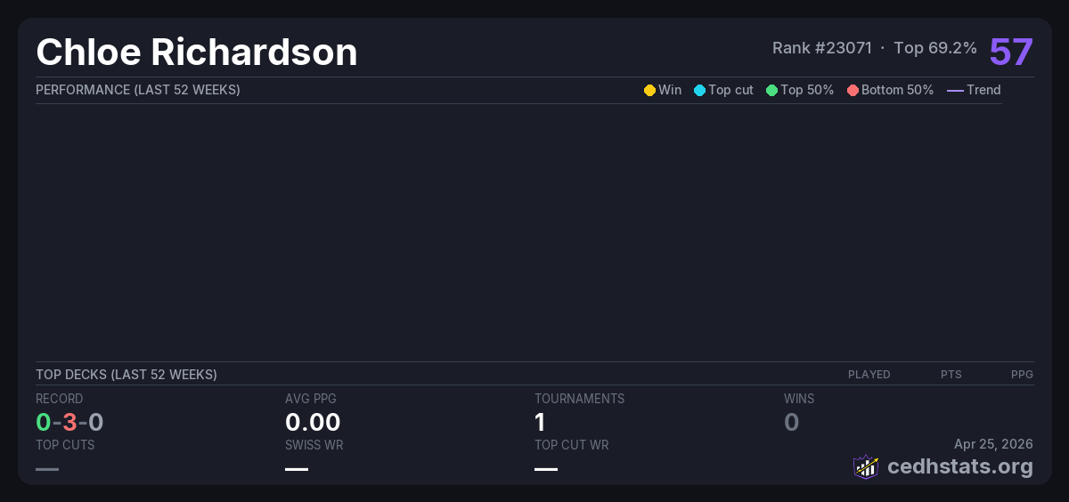 | test123 Sep 09, 2025 · 32 players | Invalid pairing | 19/32 | 0-3-0 | 0.00 | 57 |