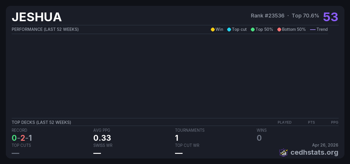 | P.A.R.A A May 27, 2025 · 16 players | Invalid pairing | 9/16 | 0-2-1 | 0.33 | 53 |