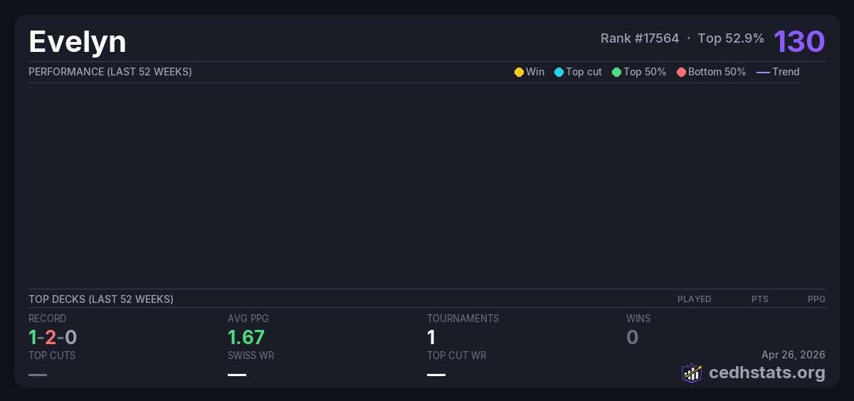 | Commander League 3 week 5 Mar 14, 2026 · 16 players | 5/16 | 1-2-0 | 1.67 | 130 |