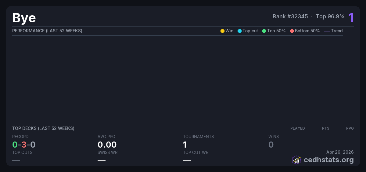 | Bracket TREEEEEEE!"!!!!!1!! M4E La Serena Aug 15, 2025 · 16 players | Invalid pairing | 16/16 | 0-3-0 | 0.00 | 1 |