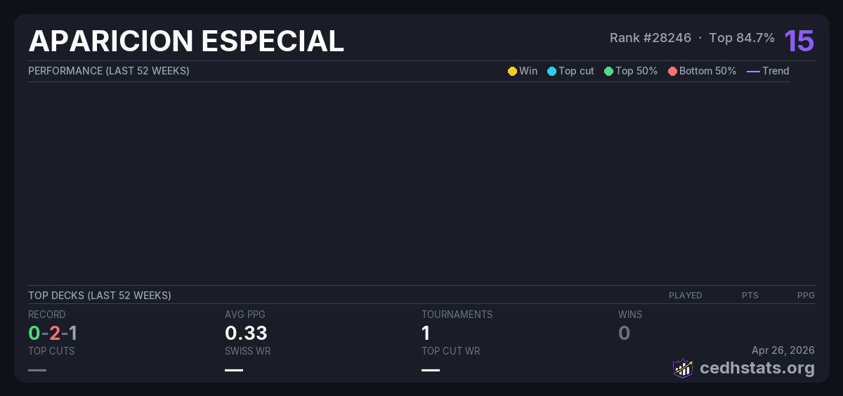 | CEDHI May 08, 2025 · 20 players | Invalid pairing | 16/20 | 0-2-1 | 0.33 | 15 |