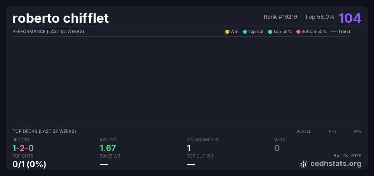 | Clasificatorio al Hall of Fame - Tercera Ronda Sep 28, 2025 · 22 players | Invalid pairing | 9/22 | 1-2-0 | 1.67 | 104 |