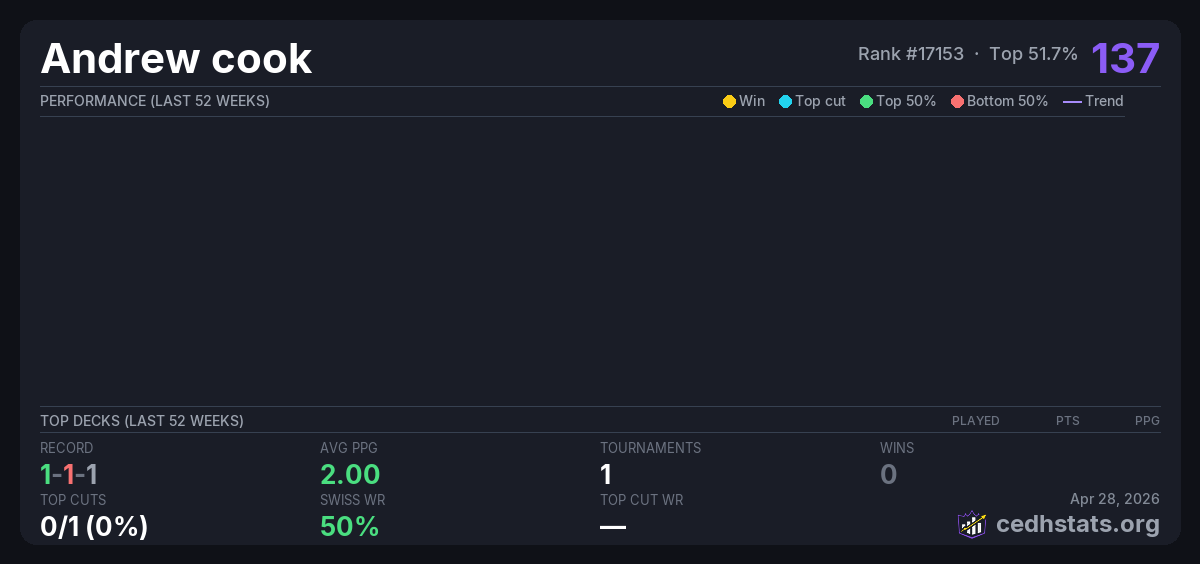 | CEDH Tournament at Collectors Connection! Apr 26, 2026 | — | 5/16 | 1-1-1 | 137 |