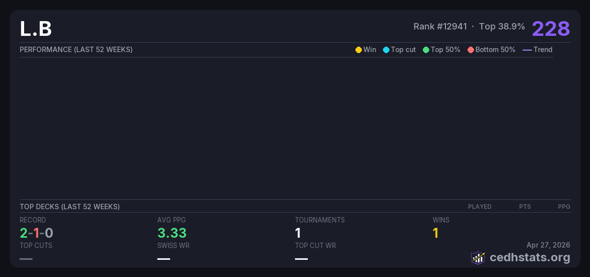 | cedeh Jun 26, 2025 · 16 players | Invalid pairing | 1/16 | 2-1-0 | 3.33 | 228 |