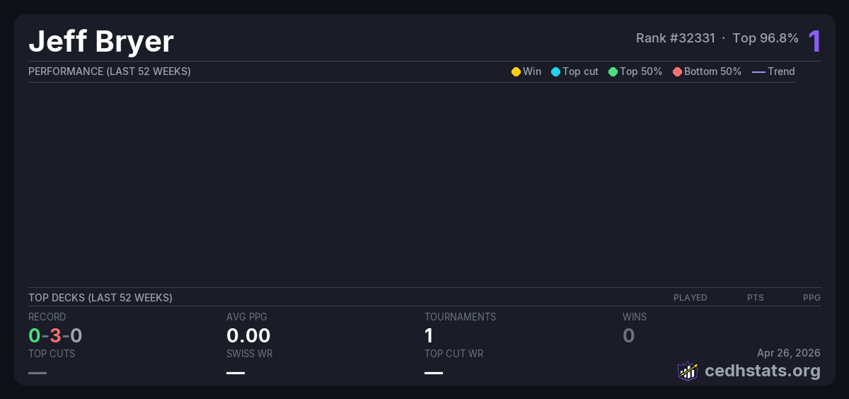 | Bracket 3 Commander Dec 07, 2025 · 16 players | 16/16 | 0-3-0 | 0.00 | 1 |