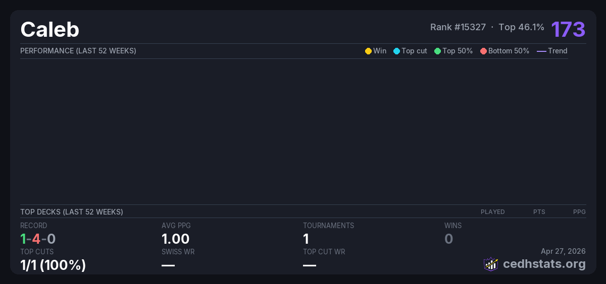 | Unaltered Precon Jan 11, 2026 · 24 players | 7/24 | 1-4-0 | 1.00 | 173 |