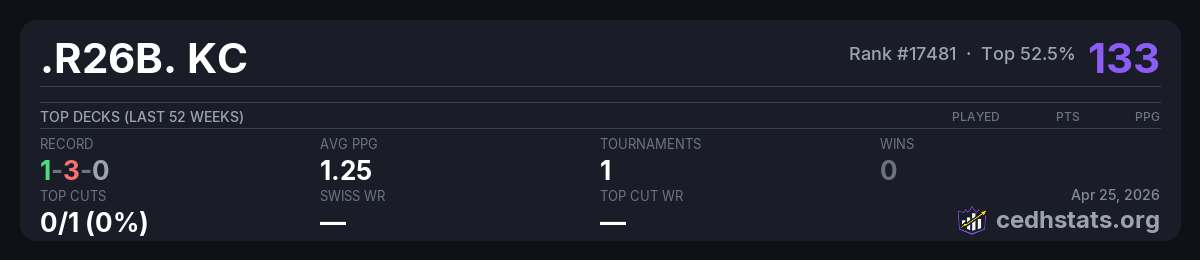 | Torneo Clasificatorio al HoF en el Ojo Apr 26, 2025 | Invalid pairing | 20/33 | 1-3-0 | 55 |
