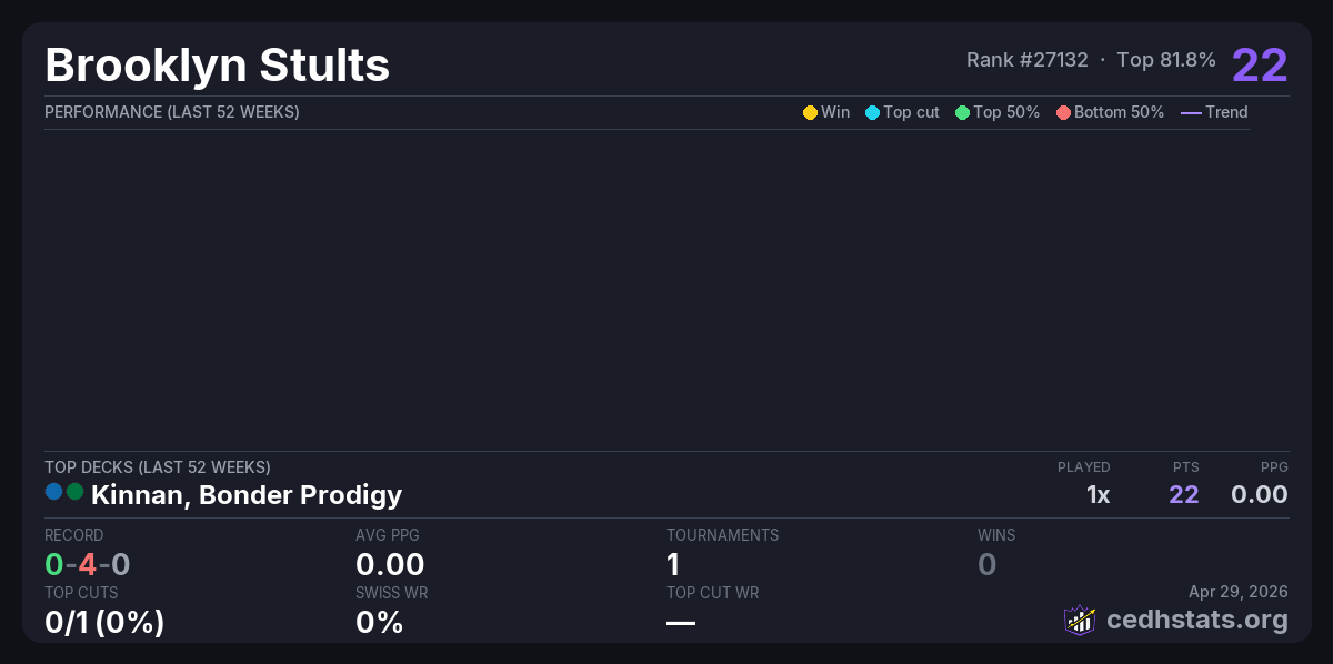 | Midgar Market Monthly 3: When it Rains, it Pours Apr 26, 2026 · 21 players | Kinnan, Bonder Prodigy | 18/21 | 0-4-0 | 0.00 | 22 |