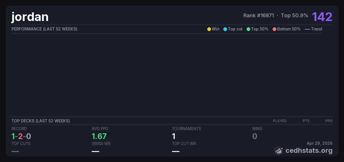 | Round2 random tournament May 24, 2025 · 20 players | Invalid pairing | 6/20 | 1-2-0 | 1.67 | 142 |
