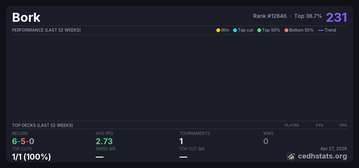 | Tournament | Deck | Result | Record | PPG | Points ? |