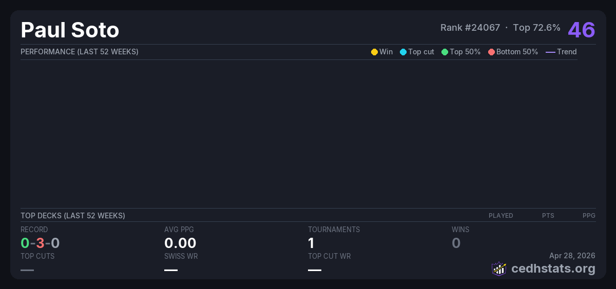 | CMFNM Aug 02, 2025 · 39 players | — | 26/39 | 0-3-0 | 0.00 | 46 |