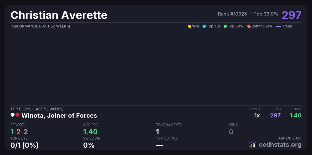 | Shuffle N Roll's cEDH Dual Land Tournament Apr 25, 2026 | Winota, Joiner of Forces | 17/52 | 1-2-2 | 297 |