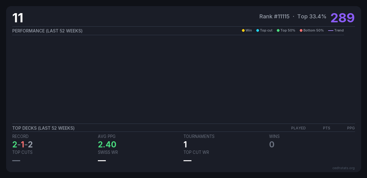 | Tournament | Deck | Result | Record | PPG | Points ? |