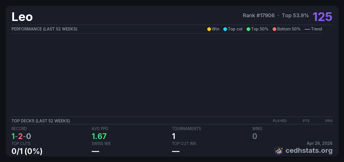 | Dragon's Nest $5 Weekly CEDH Jun 15, 2025 · 16 players | Invalid pairing | 5/16 | 1-2-0 | 1.67 | 125 |