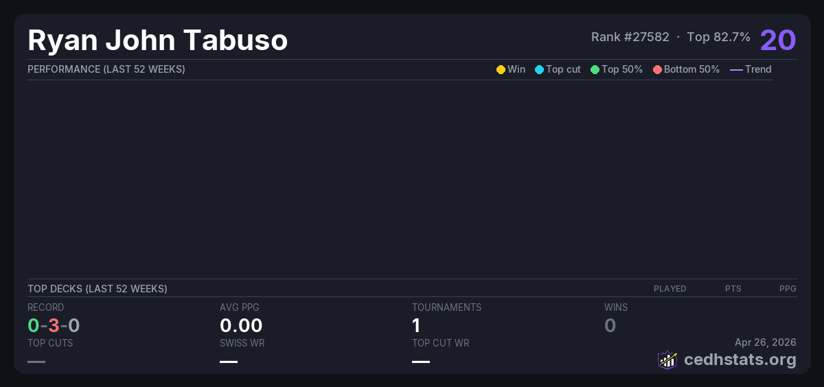 | $100 Commander Multi Jul 13, 2025 · 18 players | Invalid pairing | 14/18 | 0-3-0 | 0.00 | 20 |