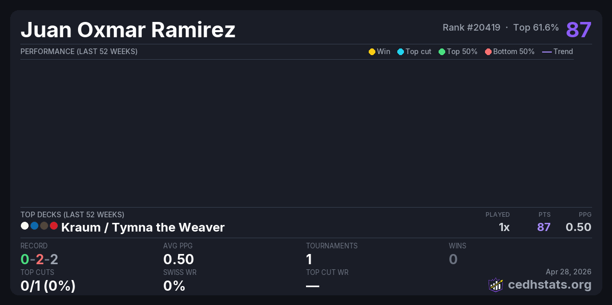 | SeaEDH 21 "The Reckoning" Apr 25, 2026 · 52 players | Kraum / Tymna | 35/52 | 0-2-2 | 0.50 | 87 |