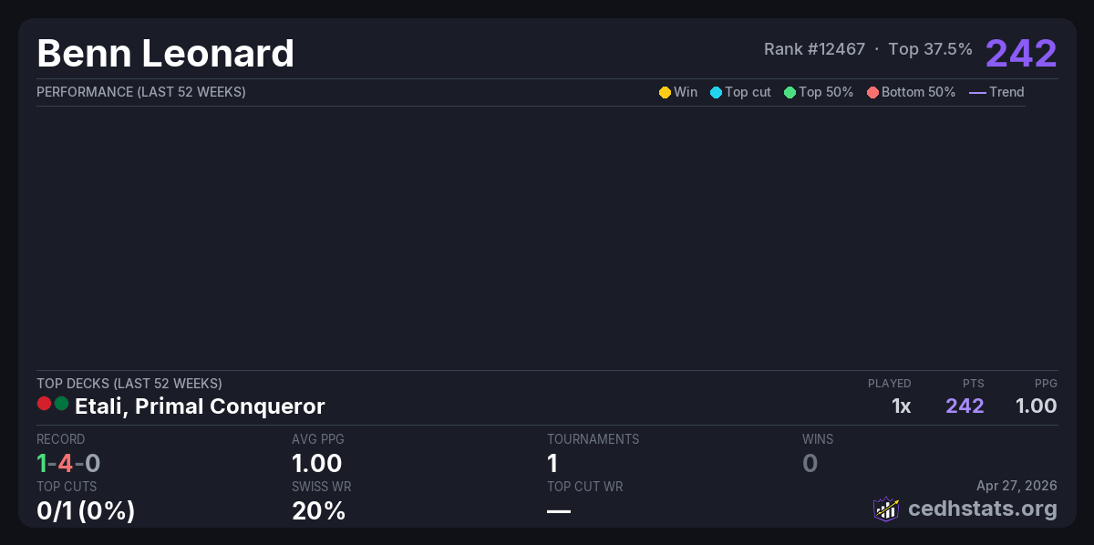 | Atlantic City TCG Show cEDH $1.5K Apr 25, 2026 · 61 players | Etali, Primal Conqueror // Etali, Primal Sickness | 30/61 | 1-4-0 | 1.00 | 242 |