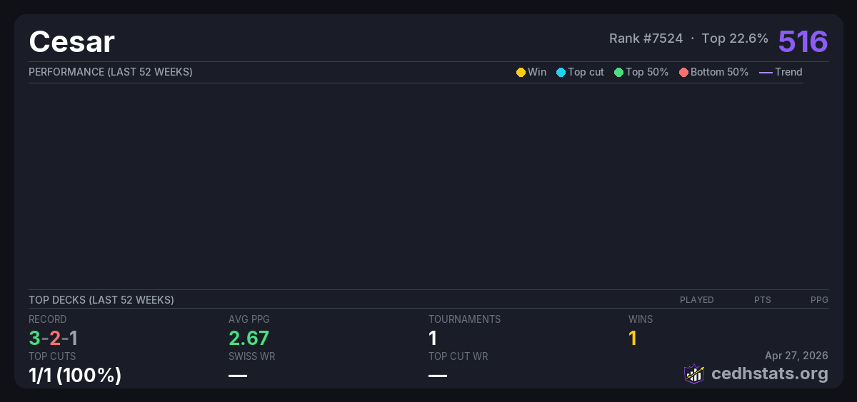 | Tournament | Deck | Result | Record | PPG | Points ? |