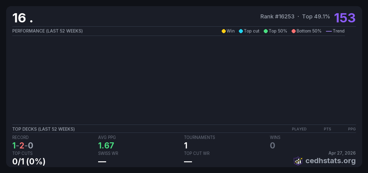 | 6月22日CEDH月赛 Jun 22, 2025 · 28 players | Invalid pairing | 8/28 | 1-2-0 | 1.67 | 153 |