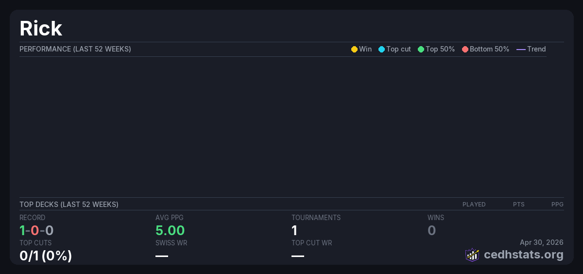 | Casual Commander :) Mar 21, 2026 · 17 players | 8/17 | 1-0-0 | 5.00 | โ |