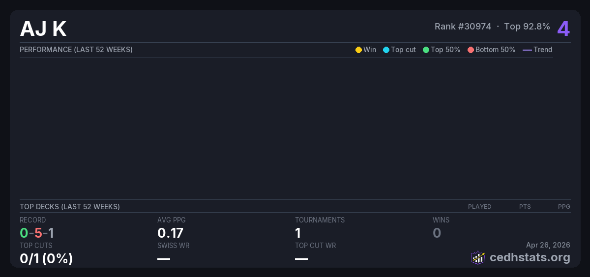 | The Iron Lion March CEDH League Mar 04, 2026 · 16 players | — | 15/16 | 0-5-1 | 0.17 | 4 |