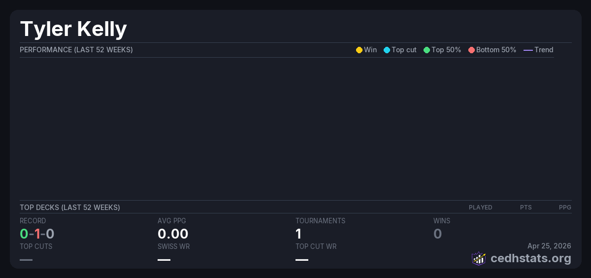 | Commander Weekly Wednesday 9/7/25 Jul 02, 2025 · 30 players | — | 21/30 | 0-1-0 | 0.00 | — |