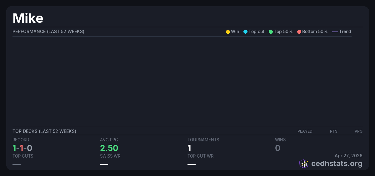 | Commander Precon League 2 Week 6 Sep 27, 2025 · 18 players | Invalid pairing | 3/18 | 1-1-0 | 2.50 | — |