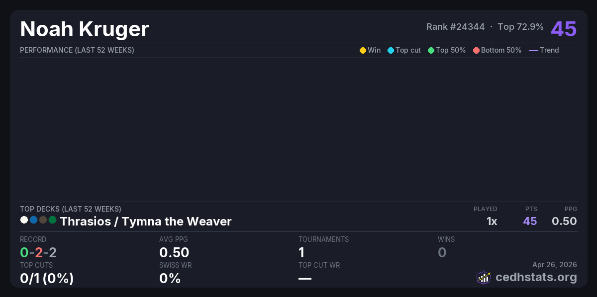 | Recycled Entertainment Dual Land CEDH Tournament Apr 25, 2026 · 35 players | Thrasios / Tymna | 25/35 | 0-2-2 | 0.50 | 45 |