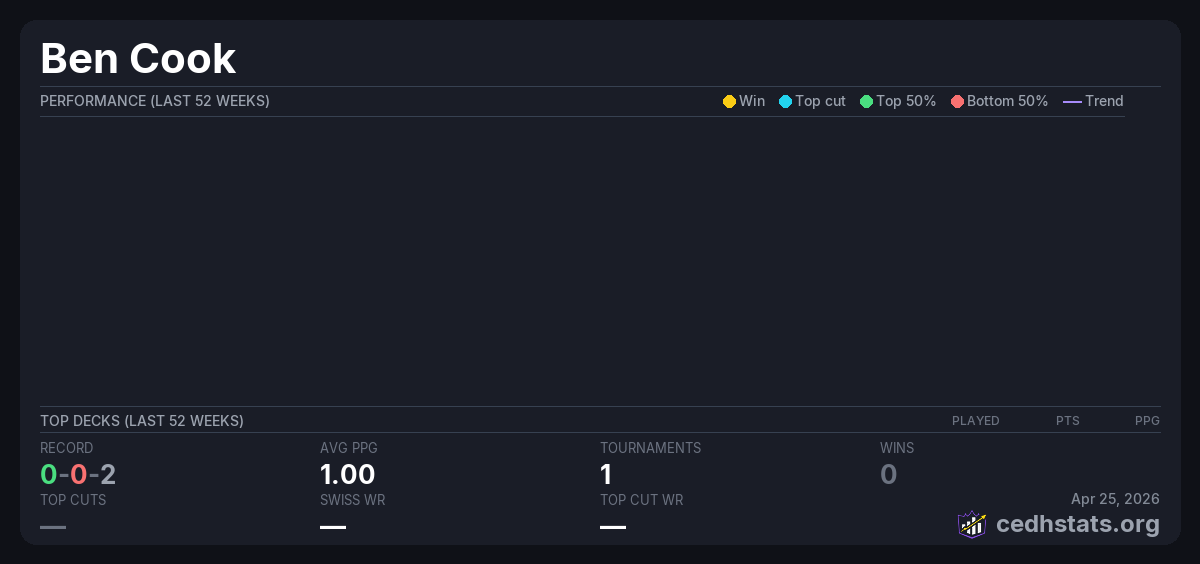 | Thursday Night Commander 2 4 26 Apr 02, 2026 · 26 players | 12/26 | 0-0-2 | 1.00 | — |
