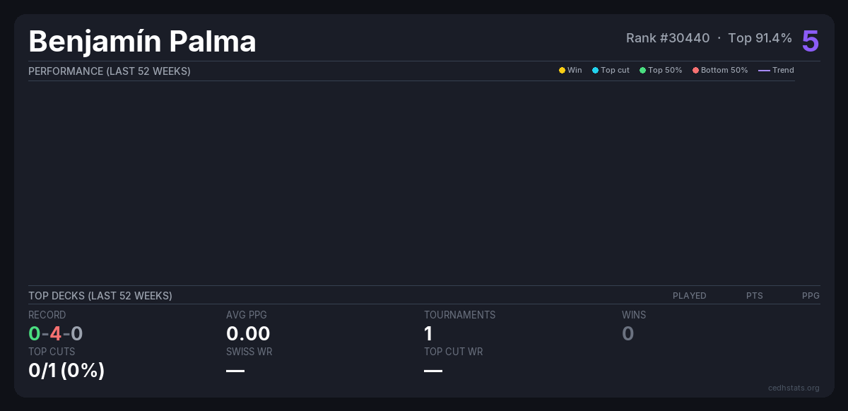| Reino de Bolsillo 12-Abril Apr 12, 2026 · 20 players | 18/20 | 0-4-0 | 0.00 | 5 |