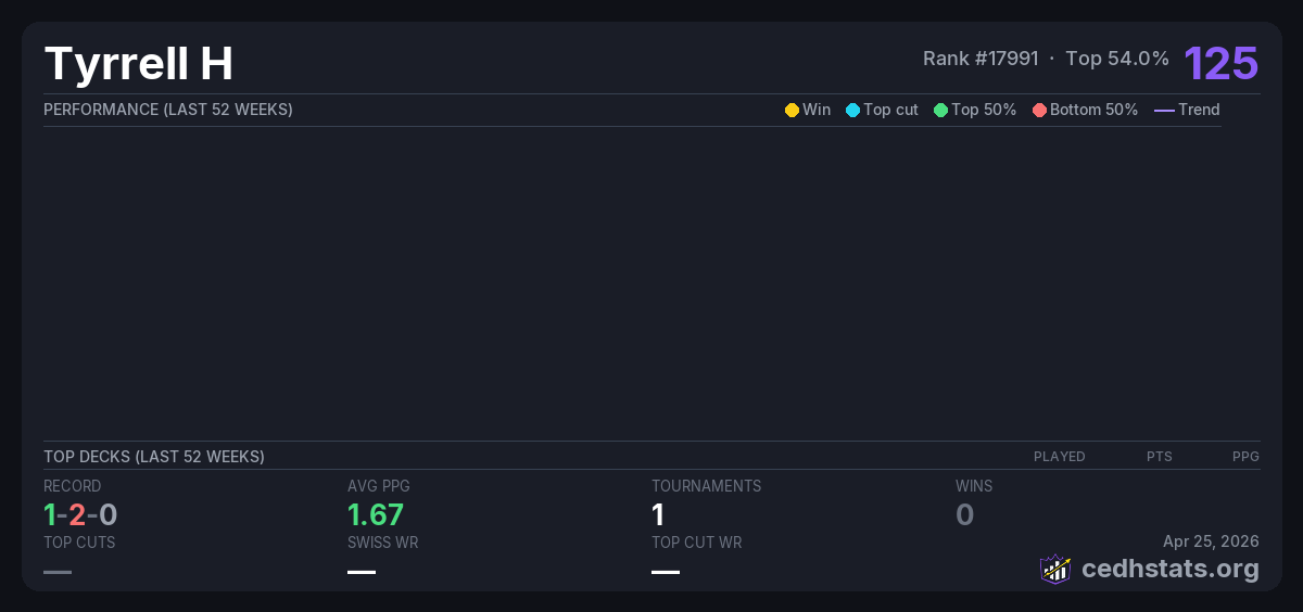 | Commander Wednesday Weekly Jan 07, 2026 · 41 players | 19/41 | 1-2-0 | 1.67 | 125 |