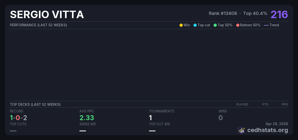 | cedhh May 01, 2025 | Invalid pairing | 2/20 | 1-0-2 | 216 |