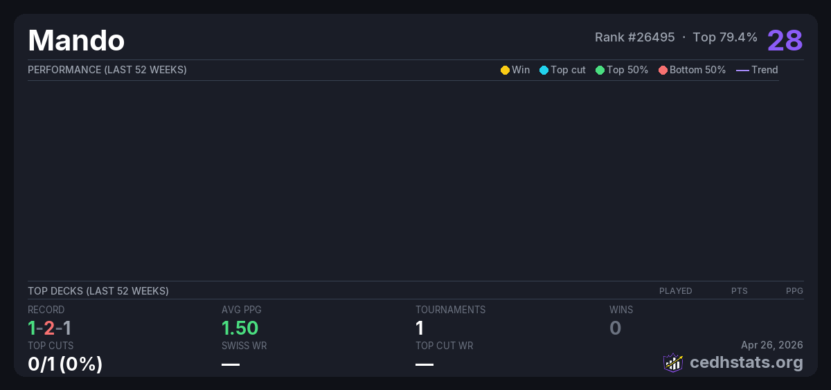 | OCT Invitational Oct 18, 2025 · 17 players | Invalid pairing | 12/17 | 1-2-1 | 1.50 | 28 |