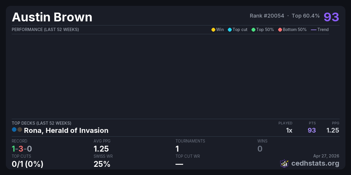 | Battlegrounds cEDH Monthly Apr 25, 2026 | Rona, Herald of Invasion // Rona, Tolarian Obliterator | 16/30 | 1-3-0 | 93 |