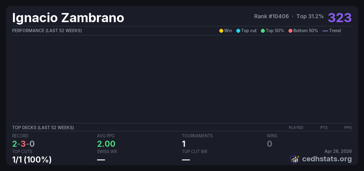 | Torneo cEDH - A Beneficio 1 Feb 21, 2026 · 20 players | 2/20 | 2-3-0 | 2.00 | 323 |
