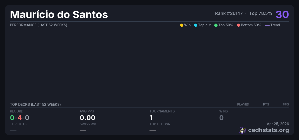 | Casa de Ruter CEDH Janeiro 2026 Jan 24, 2026 · 28 players | 20/28 | 0-4-0 | 0.00 | 30 |