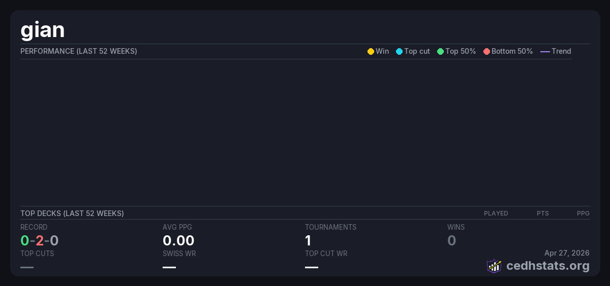 | just random tournament May 17, 2025 · 17 players | Invalid pairing | 14/17 | 0-2-0 | 0.00 | — |