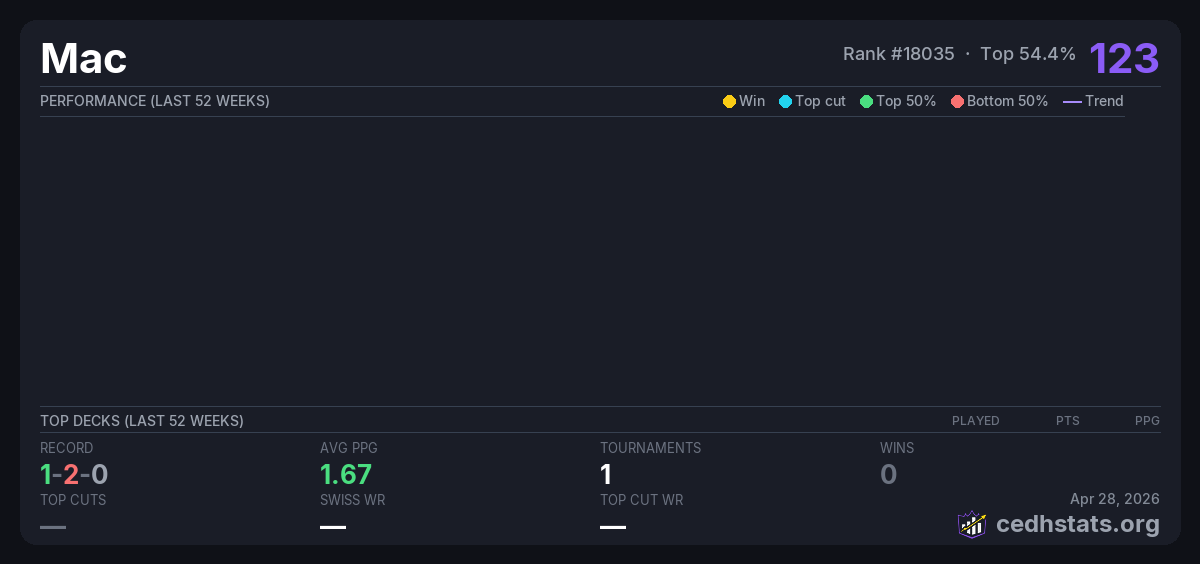 | Tournament | Deck | Result | Record | PPG | Points ? |