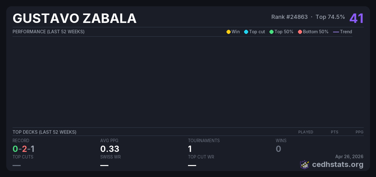 | Para Apr 29, 2025 · 16 players | Invalid pairing | 10/16 | 0-2-1 | 0.33 | 41 |